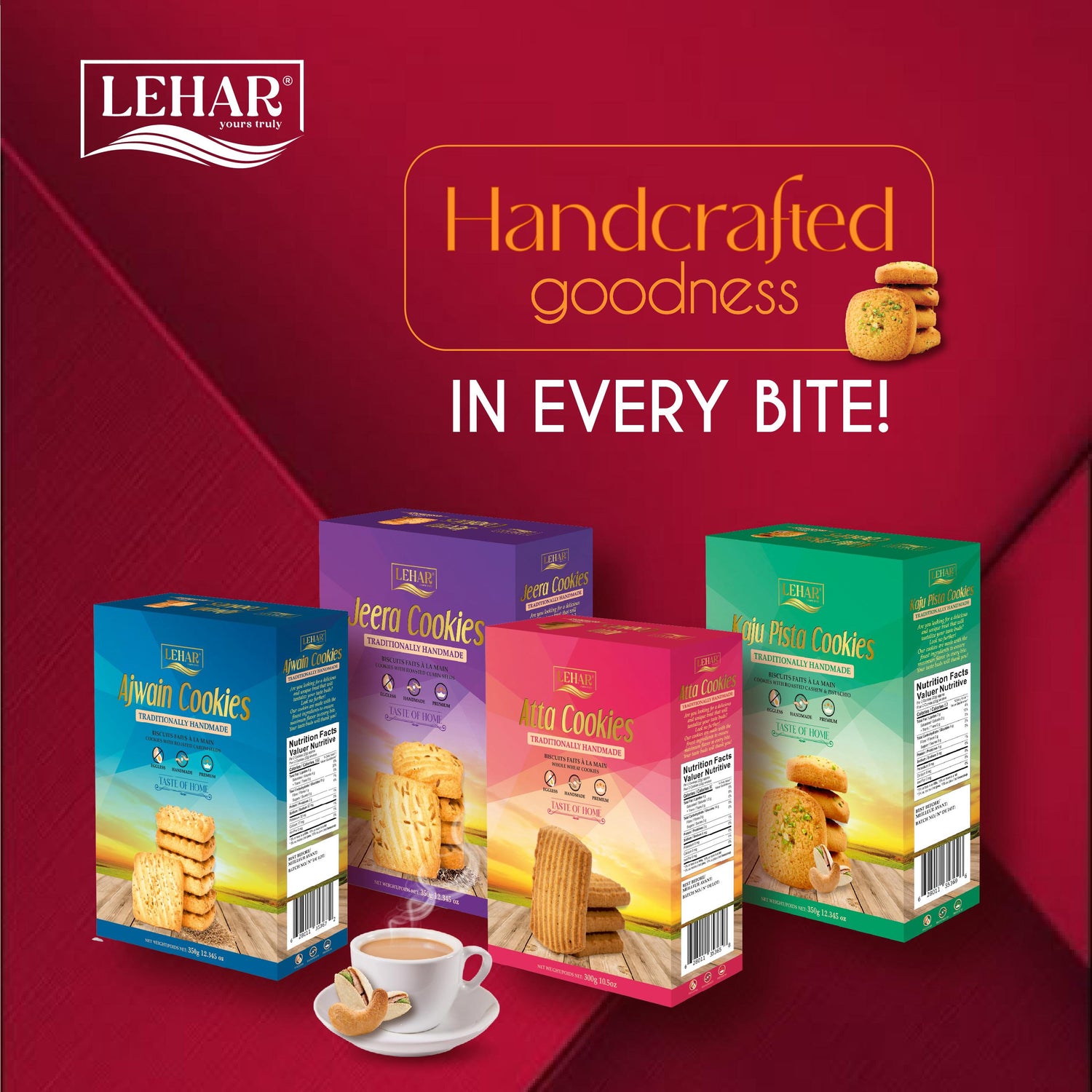 Step into a world of nostalgia and warmth with our Lehar Signature Bakes—a selection of traditional Indian cookies crafted to bring back memories of home. Each bite pays tribute to time honored recipes, evoking the comfort of shared laughter, family gatherings, and dadaji’s special treats. Baked with clean ingredients and a generous sprinkle of love, these cookies promise to rekindle your connection with cherished traditions.